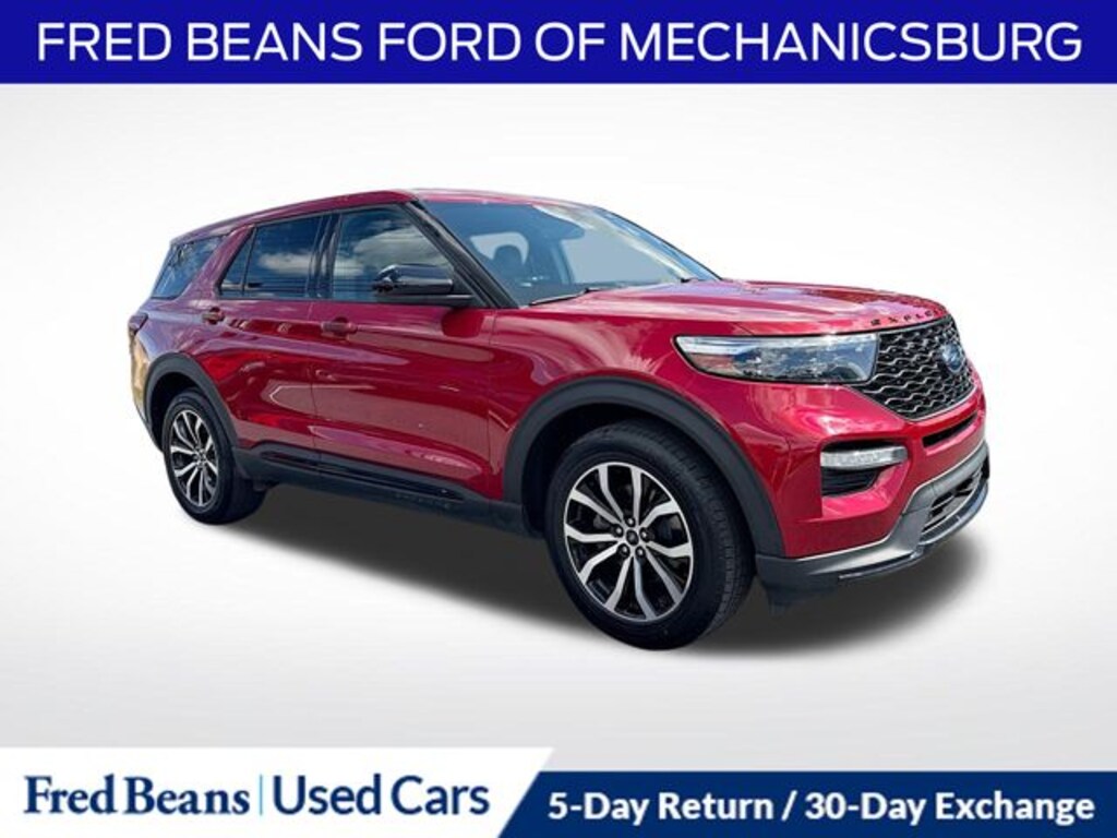 The exterior of this Explorer ST is dressed to impress in a bold Rapid Red Metallic Tinted Clearcoat finish, complemented by 20" machined aluminum wheels with painted pockets. The sporty styling cues, including the unique grille, front and rear fascias, and dual exhaust tips, give this SUV a commanding presence on the road.