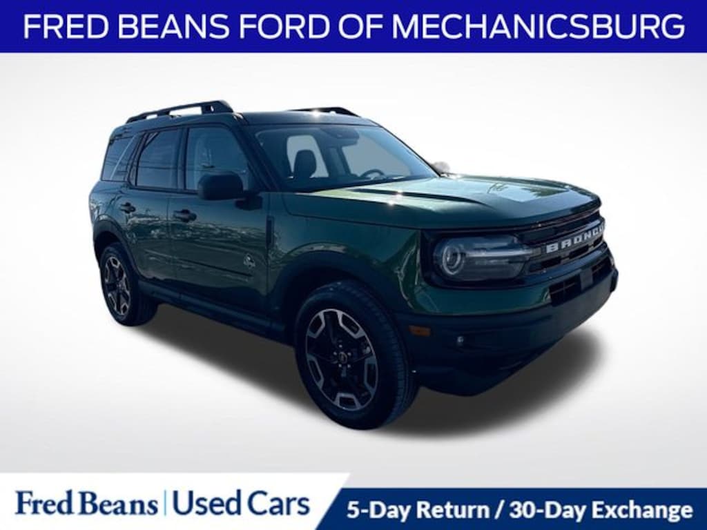Recent Arrival! 2023 Ford Bronco Sport Outer Banks 1.5L EcoBoost 8-Speed Automatic 4WD 4D Sport Utility Eruption Green Metallic Bought & Serviced at Fred Beans, 3 Month / 4,000 Mile Comprehensive Warranty, Factory Certified Vehicle, 5 Day Return / 30 Day Exchange, Auto Reward Program, Navigation System, 3.80 Axle Ratio, 4-Wheel Disc Brakes, 4G LTE Wi-Fi Hotspot Credit, 6 Speakers, ABS brakes, Air Conditioning, Alloy wheels, AM/FM radio: SiriusXM, AM/FM Stereo, Auto High-beam Headlights, Auto-dimming Rear-View mirror, Automatic temperature control, Brake assist, Cargo Management System, Compass, Delay-off headlights, Driver door bin, Driver vanity mirror, Dual front impact airbags, Dual front side impact airbags, Electronic Stability Control, Emergency communication system: SYNC 3 911 Assist, Equipment Group 300A, Evasive Steering Assist, Ford Co-Pilot360 Assist+, Four wheel independent suspension, Front anti-roll bar, Front Bucket Seats, Front Center Armrest, Front dual zone A/C, Front fog lights, Front License Plate Bracket, Front reading lights, Fully automatic headlights, HD Radio, Heated door mirrors, Heated front seats, Heated steering wheel, Illuminated entry, Intelligent Adaptive Cruise Control w/Stop & Go, Knee airbag, Leather Trimmed Heated Sport Contour Bucket Seats, Low tire pressure warning, Memory seat, Occupant sensing airbag, Outside temperature display, Overhead airbag, Overhead console, Panic alarm, Passenger door bin, Passenger vanity mirror, Power door mirrors, Power driver seat, Power Moonroof, Power passenger seat, Power steering, Power windows, Radio data system, Rain sensing wipers, Rear anti-roll bar, Rear Parking Sensors, Rear reading lights, Rear seat center armrest, Rear window defroster, Rear window wiper, Remote keyless entry, Security system, SiriusXM, Speed control, Speed-sensing steering, Speed-Sensitive Wipers, Split folding rear seat, Steering wheel mounted audio controls, SYNC 3 Communications & Entertainment System, SYNC 3/Apple CarPlay/Android Auto, Tachometer, Tech Package, Telescoping steering wheel, Tilt steering wheel, Traction control, Trip computer, Universal Garage Door Opener (UGDO), Variably intermittent wipers, Voice-Activated Touchscreen Navigation System, Wheels: 18" Ebony Black-Painted Aluminum, Wireless Charging Pad, FORD BLUE CERTIFIED PRE-OWNED.